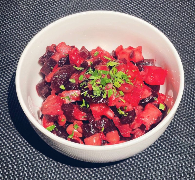 Фасоль, свекла, филе сельди, картофель, лук, специи